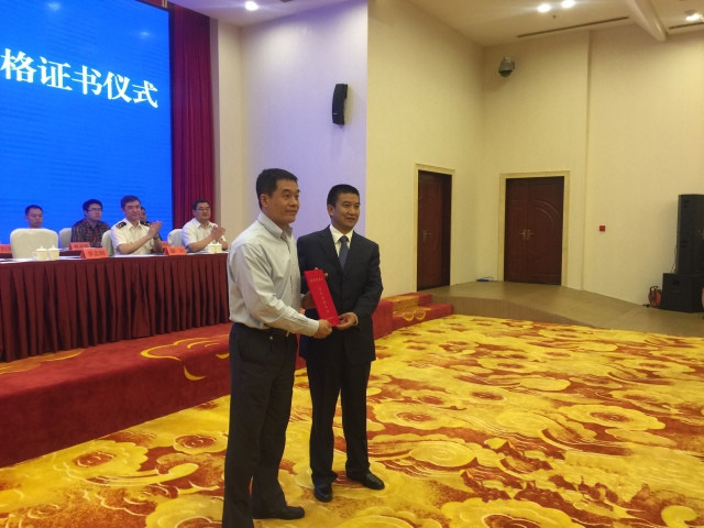 聯(lián)合驗(yàn)收組組長(zhǎng)、海關(guān)總署加貿(mào)司李志輝副司長(zhǎng)向昆明綜合保稅區(qū)管委會(huì)專職副主任張宏頒發(fā)合格證書
